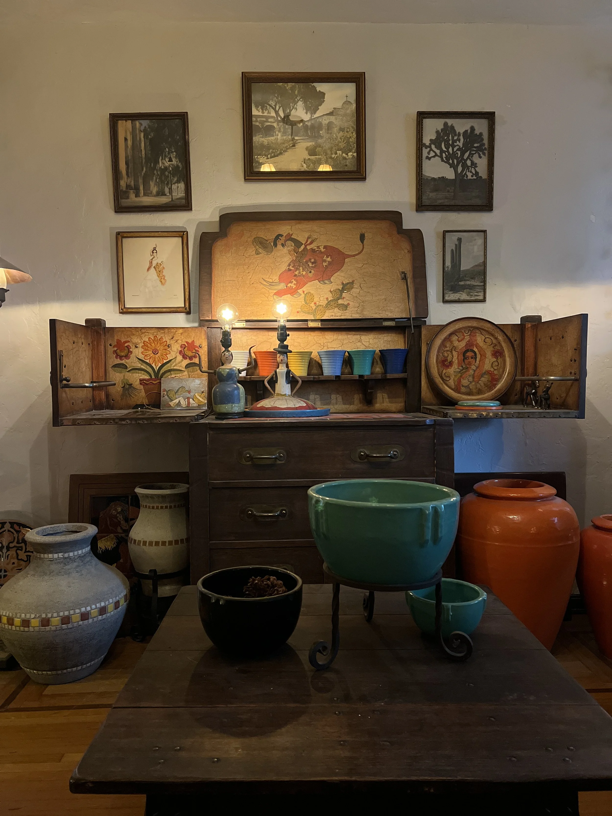 Over the years, her collection expanded to include vintage California pottery, early California tile, lighting, artwork from the 1920s and 1930s, most of all her beloved collection of paintings by Juan Duran Tinoco. She is especially devoted to the history behind each piece — the makers, the artists, and the stories they carried — and she approaches every object with a commitment to research, accuracy, and honoring the people who created them.